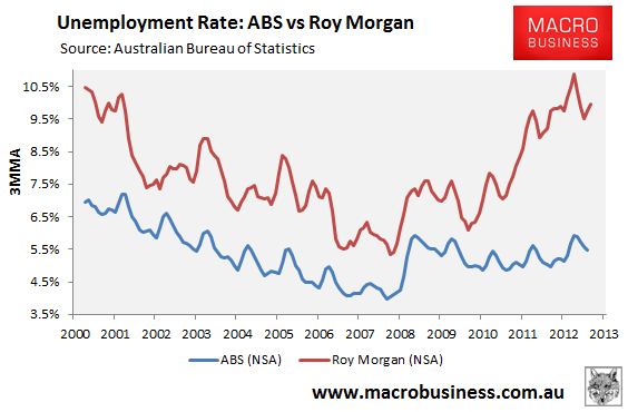 The latest Roy Morgan unemployment estimate of 10.1% is a substantial 4.4% more than currently quoted by the ABS for July 2013 (5.7%)