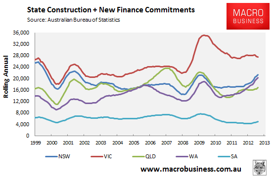 In fact, at the end of 2012, dwelling construction rates in New South Wales were near the lowest level in 30 years, driven by a slump in detached house construction (see next chart).