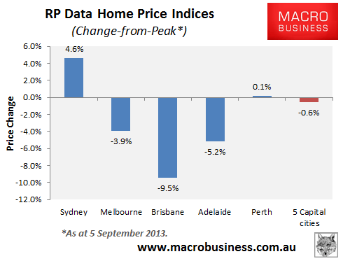Values are down only 0.6% since peak at the 5-city level, with all major capitals except Sydney and Perth in negative territory (see next chart).