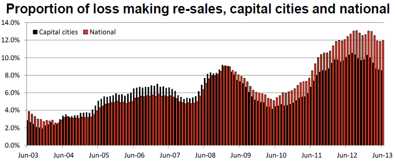 RP Data has today released its Pain & Gain Report for the June quarter of 2013, which reveals that 12.0% of all home which sold over the three months to June 2013 incurred a gross loss. This compares with a peak of 13.1% of re-sales recording a loss over the three months ending January 2013 (see next chart).