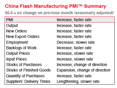 The China Flash PMI is out for October and is decent beat at 50.9 versus 50.4 expected. The internals look OK too: