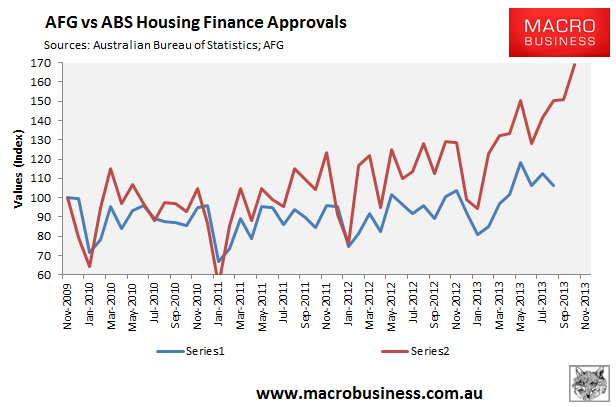 Average loan sizes are growing in all of the eastern states now. Victoria is pouring it on and although its supply situation is awful it is chasing Sydney at a mere sprint versus the latter’s jet pack. Here’s the chart comparing AFG with ABS Housing Finance: