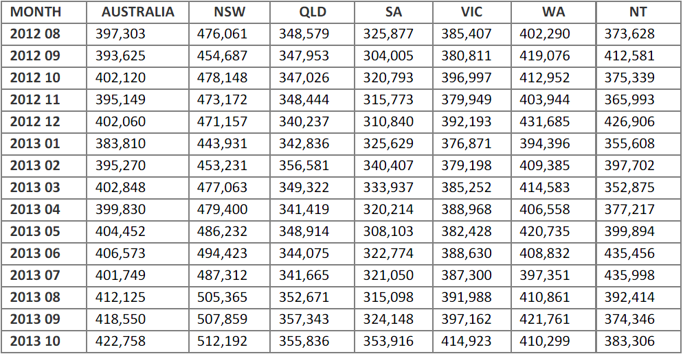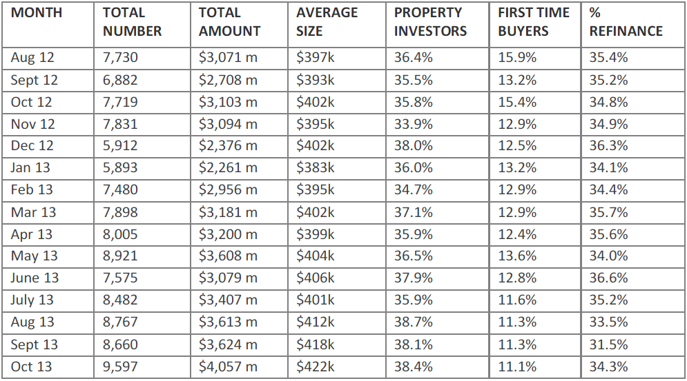 AFG, Australia’s largest mortgage broker, processed over $4 billion in home loans last month – its biggest month ever, and the first time the company’s national 1,900 brokers have collectively broken through the $4 billion mark. The $4,057 million figure is 12% higher than the $3,624 million processed the month before, which was itself a record. The October 2013 figure is also 30% higher than that recorded by the company for October 2012, and 61% higher than for October 2011, showing how far the mortgage market, and broader economy, has recovered over the past two years. Across the nation there were significant variations in different markets. South Australia’s figures were 19% higher than the month before and Victoria’s 18.8%. Queensland and NSW occupied the middle ground with increases of 11.8% and 10.9% respectively, while WA’s volumes were up only 5% on September. The WA figure did come off a high base, and the relatively large number of first home buyers in the state was another reason why uplift was less dramatic than elsewhere.