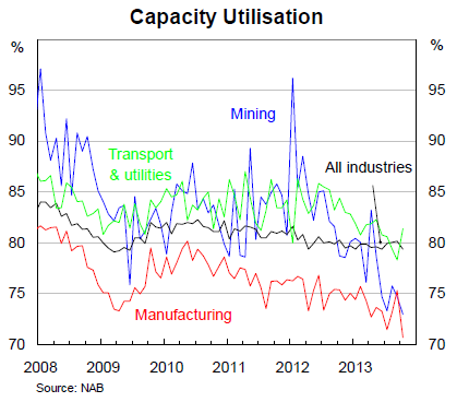 Firms reassess their confidence on the outlook as business conditions undershoot again. Capacity utilisation falls sharply – especially in manufacturing, construction, mining and retail – despite low interest rates and improved housing and equity markets. Other forward indicators deteriorate, paring back earlier gains and implying a continuing soft outlook for domestic demand. Price inflation outpaced by costs growth suggesting margins still tightening. Rate cut still expected in 2014 but – given RBA comfort with current settings – delayed till mid 2014. Unemployment key to how many cut(s) required.