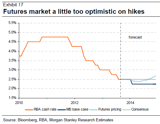 The RBA has already taken the cash rate to a record low of 2.5%, and we are out of consensus in seeing another cut to 2.25% in 1Q14 as odds-on. However, we see the length of the easing cycle as more important than the depth, with the RBA historically hiking rates nine months after the trough vs up to 21 months this cycle.