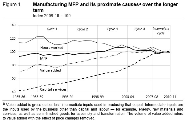 There was a shift in Manufacturing MFP and its proximate causes in the most recent complete productivity cycle (cycle 4), compared with trends going back to 1985-86 (figure 1).
