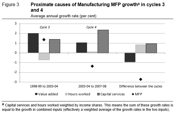 The decline of 2.7 percentage points in the average annual rate of MFP growth between cycles 3 and 4 was associated with nearly equal parts of: a decline in value added growth; an increase in growth in capital services; and a reversal in the decline of hours worked (figure 3).