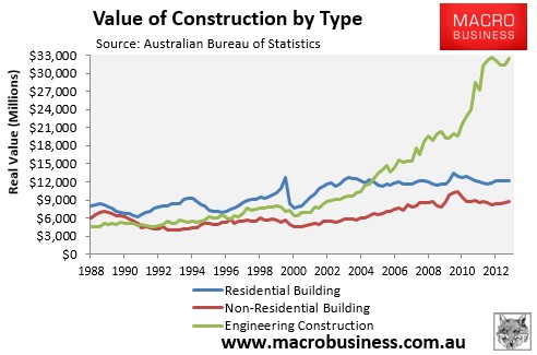 Obviously, the MBA’s warning accords with the views expressed on MacroBusiness for more than a year – a view that is based on simple arithmetic. The fact of the matter is that engineering construction (a proxy for mining investment) is currently more than 2.5 times the size of residential construction (see next chart).