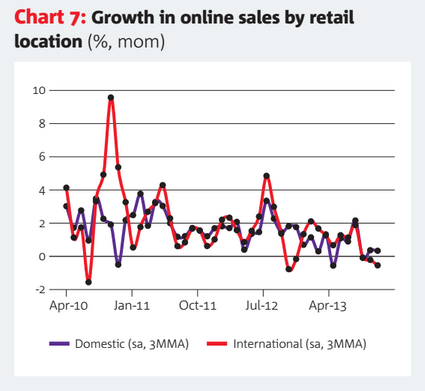 As well, the categories that NAB cites as slowing online do match with those that are picking up most in tradition retail: Daily Deals, Recreational & Personal Goods, Fashion and Toys & Electronic Games online versus much the same discretionary stuff in store: