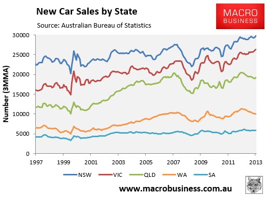 Looking at the mainland states, you can see that new motor vehicle sales growth is particularly strong in New South Wales and Victoria, but weak in Queensland and Western Australia: