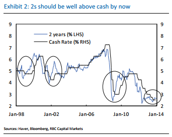 Our views around the cash rate into 2015 remain broadly unchanged; whilst the low point may be 25bps higher than we were previously expecting, cash is likely to stay at an historical low for an extended period amid both domestic and global challenges. Sub trend growth as the rotation in activity away from capex/mining remains tough, and a weak labour market suggests that an easing bias will linger and the risks for 2014 are still skewed toward a cut rather than a hike. Indeed, we find it hard to make the case for policy normalisation until further into 2015. Globally, uncertainty over EM, Chinese growth, credit and banking, and lingering European headwinds are all likely to flare up at various times during the year.
