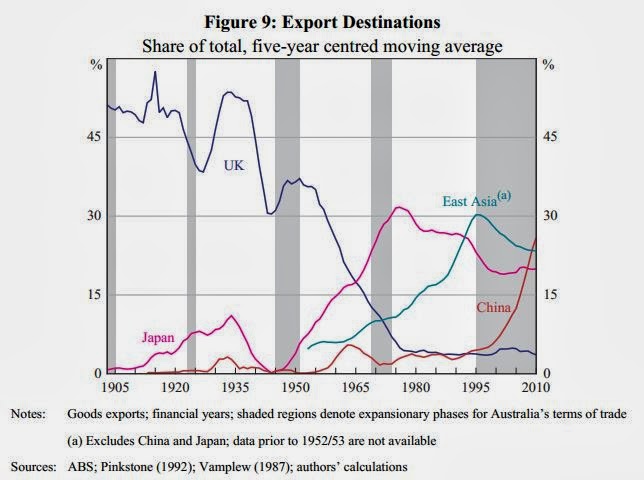 Form the 1960s, the rise of Japan, followed by South Korea and Taiwan, Singapore, Malaysia, Thailand and other non-communist countries of Southeast Asia had provided significant expansion of export markets for Australian commodities, but had not led to a sustained structural increase in their prices.