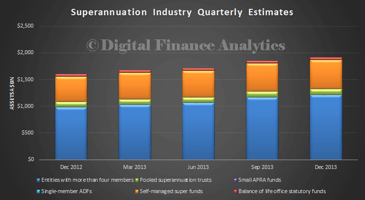 APRA today released its quarterly superannuation statistics. They report that total estimated assets, which include the assets of self-managed superannuation funds and the balance of life office statutory funds, rose to $1.8 trillion at 31 December 2013. Read about superannuation in our series of posts, The Superannuation Story.