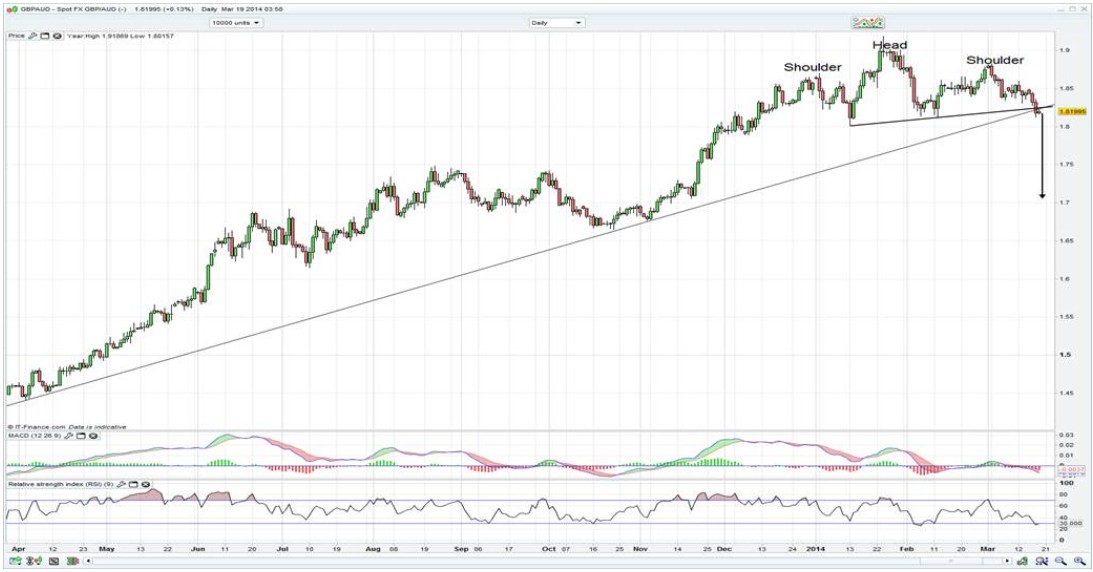 GBP/AUD especially looks primed for a big move to the downside, having broken and closed below the April 2013 uptrend and neckline of the head and shoulders pattern. The target on this pattern would be 1.71, so Australians looking to join the rest of the world by buying property in London could hold off and get take advantage of a stronger AUD.