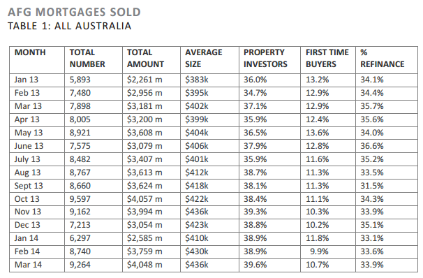A total of 3,384 loans with a total value of $1.6 billion was processed for investors during March by AFG. The company has 11% of the total mortgage market in Australia (Source: AFG and ABS statistics) and while its figures are not definitive, they are strongly indicative of data published by the ABS six weeks later.