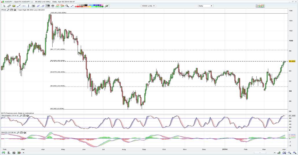 The BoJ are looking for CPI to increase to 2% by 2015, so the fact that Japanese companies see inflation 50 basis points below this level is a concern, with expectations 30 basis points below over a three and five year period as well. Additional easing seems logical for June or July, although the BoJ will be hoping for a strong US non-farm payrolls on Friday to help push up USD/JPY and once again promote imported inflation. Still, USD/JPY looks strong and a close above 103.66 and 103.76 (the 61.8% retracement of the January to February sell-off and March 7 high) would suggest a test of the 105.45 high.