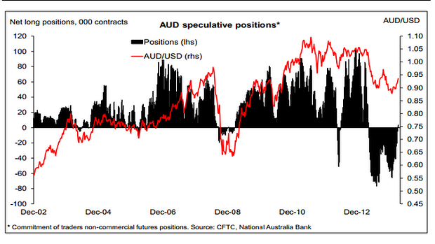 From NAB this morning via the SMH blog comes a chart of last week’s Commitment of Traders report on the Aussie showing that speculators have shifted to net long, from -4.900 to 3300: