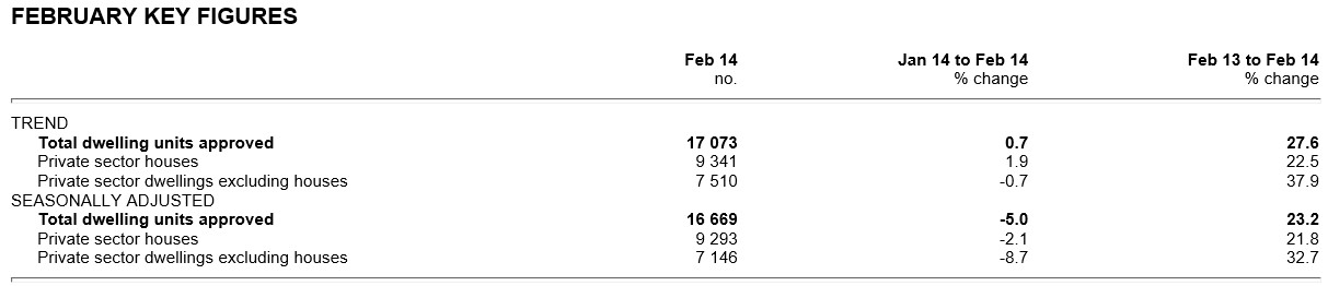 In the year to February 2014, dwelling approvals rose by a seasonally-adjusted 23.2%, with house approvals up by 21.8% and unit approvals up by 32.7%: