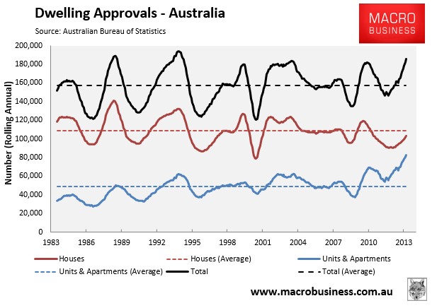 In annual terms, dwelling approvals are running near record highs, as shown by the below chart, with weakness in detached house approvals more than offset by strength in unit & apartment approvals. However, as noted previously, approvals remain fairly depressed overall in population-adjusted terms, given that Australia’s population has grown by around 45% over the past 30-years.