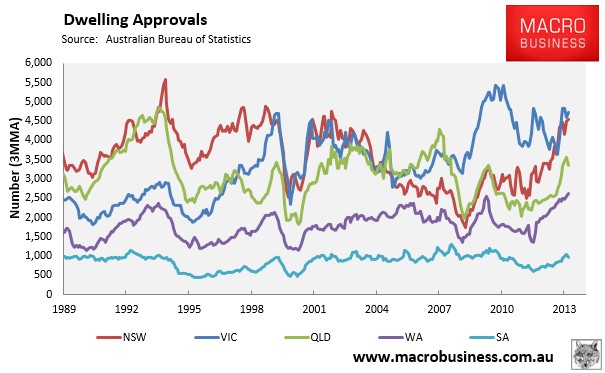 As you can see, dwelling approvals nationally continue to trend up after bottoming in late-2011. This recovery has been driven by a pick-up in both unit & apartment approvals (although they remain volatile) and house approvals (although they remain fairly weak overall).