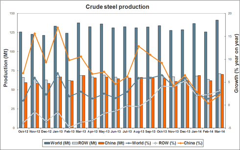 World crude steel production for the 65 countries reporting to the World Steel Association (worldsteel) was 141 million tonnes (Mt) in March 2014, an increase of 2.7% compared to March 2013.