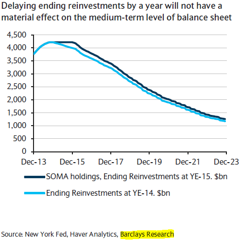 Fed officials are afraid that if the balance sheet begins to naturally decline, the markets will interpret this as additional tightening. But once again, by delaying step 3, the Fed introduces incremental uncertainty. The markets and the media will be buzzing with “when does the reinvestment policy end?” question. The reality is that this delay will have a minimal impact on the trajectory of the massive balances at the central bank.