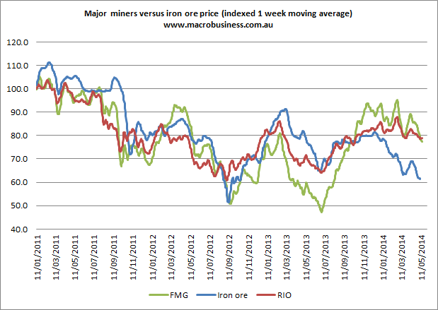 It is clear that RIO is now seriously out-performing FMG on the way down, a reversal of the way up: