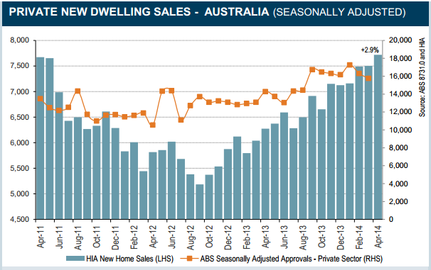 Total seasonally adjusted new home sales posted their fourth consecutive rise in April 2014, increasing by 2.9 per cent. The headline result was driven by a 9.3 per cent lift in multi-unit sales which was helpfully complimented by a 1.8 per cent increase in detached house sales.