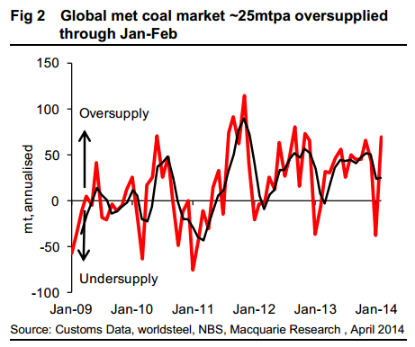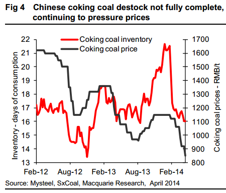 The other factor behind the extreme weakness in met coal has been the relative absence of China from the seaborne demand side, with its seaborne met coal imports down 22%YoY through 1Q14. Chinese steel mills entered a prolonged period of destocking at the end of January, a process which is yet to be fully completed.