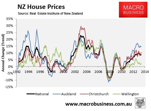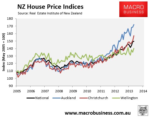 Annual house price growth fell to 8.5% nationally in the year to April 2014 to be 17.5% above their November 2007 peak. Prices in New Zealand’s largest city, Auckland, rose by 15.2% in the year to April to be 34.5% above their July 2007 peak. This was followed by New Zealand’s second biggest city, Christchurch, where prices rose by 13.6% over the year to be 25.2% above their 2007 peak. Finally, prices in the capital, Wellington, rose by only 1.0% in the year to April and were only 4.4% above the September 2007 peak.