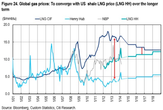 Australia’s magnificent seven LNG projects run at a break even between $12 and $14, suggesting a squeeze on profitability and returns on equity if Citi’s forecasts prove to be accurate. For Australia it means more falls in the terms of trade as LNG follows the pattern set by coal and now iron ore.