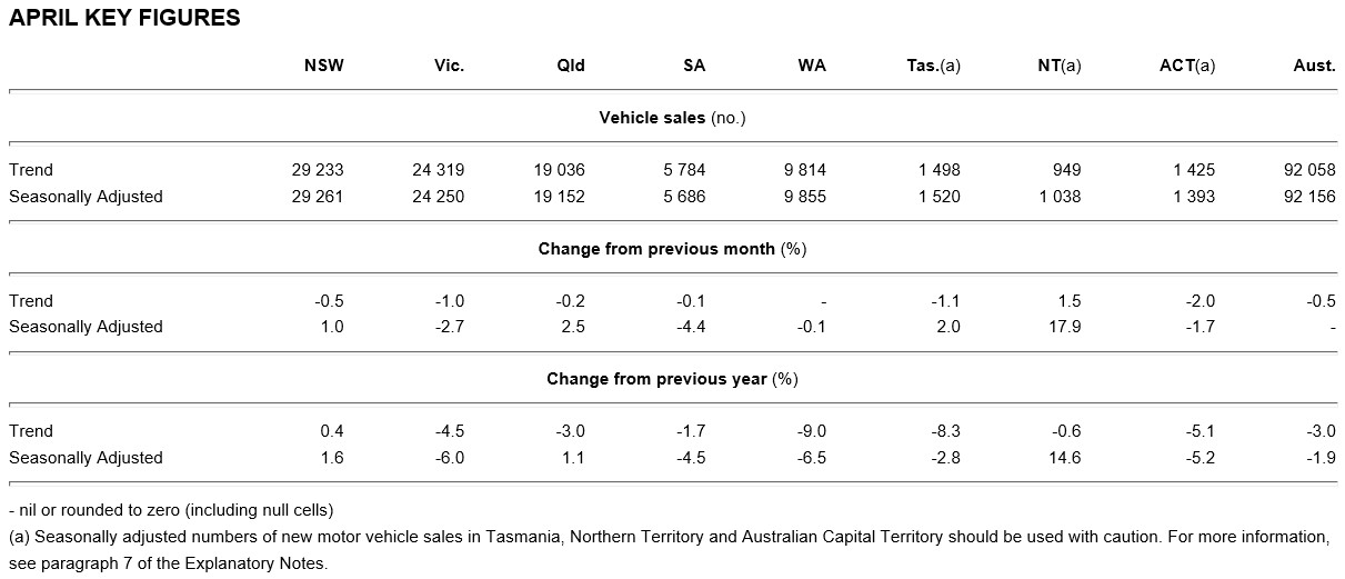 The Australian Bureau of Statistics (ABS) has just released new motor vehicle sales for the month of April 2014, which registered no change seasonally adjusted change in the number of sales, but a 1.9% decrease over the year (see next table). The result followed third consecutive monthly declines in sales.