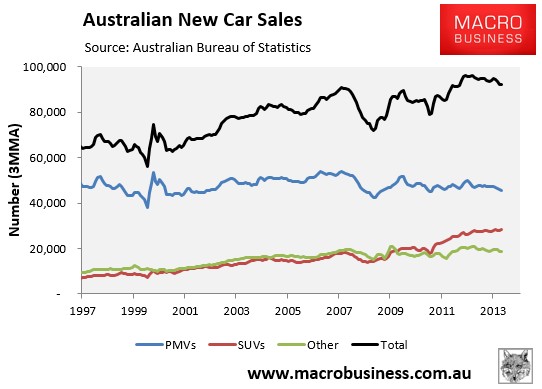 As shown in the below, overall new car sales peaked in the first quarter of 2013 and have since drifted downwards, with even sales of the once booming Sports Utility Vehicles (4WDs) slowing: