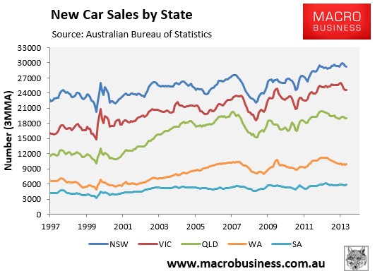 Looking at the mainland states, you can see that new motor vehicle sales have been pulled-down by Victoria, Queensland and Western Australia, with New South Wales joining the fray only recently: