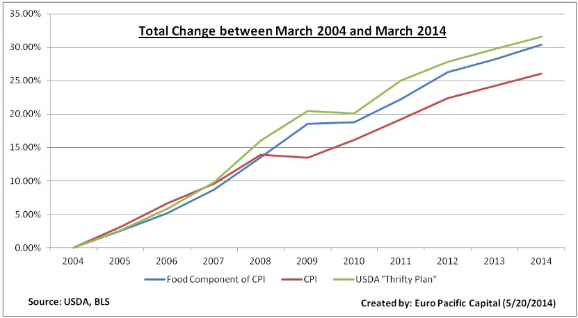 From 2004 to 2014 the CPI was up 26% or about 2.5% per year. However, the food component of the CPI was up 30% and the USDA estimate for a family of four was up 32% (The higher cost “liberal plan” increased even more, at 35% over that time). When comparing two sets of government data, it’s tough to credit one over the other. But the USDA data is likely much closer to what most of us who shop for food actually experience. If accurate, the USDA numbers mean that over the past decade the costs to actually feed a family increased 23% more than most economists like to tell us.