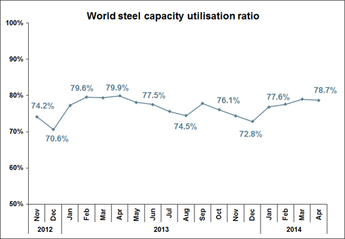 The crude steel capacity utilisation ratio for the 65 countries in April 2014 was 78.7% and it is 1.2 percentage points lower than April 2013. Compared to March 2014, it is 0.3 percentage points lower.