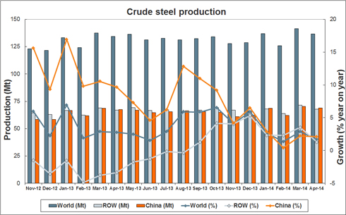 World crude steel production for the 65 countries reporting to the World Steel Association (worldsteel) was 137 million tonnes (Mt) in April 2014, an increase of 1.7% compared to April 2013.