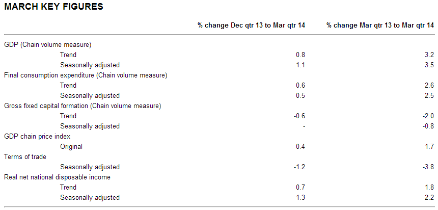 The Australian Bureau of Statistics has just released National Accounts data and it’s good as expected at 1.1% for the quarter and 3.5% for the year: