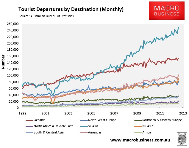 Yesterday’s release of the overseas short-term arrivals and departures figures for April revealed a huge surge in the number of Australians holidaying overseas in the bogan hotspots of South East Asia.