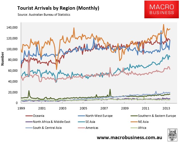 By contrast, the most foreign visitors to Australia came from NE Asia (mostly China), accounted for 24% of arrivals in April, followed by Oceania and North-West Europe (each 20%):