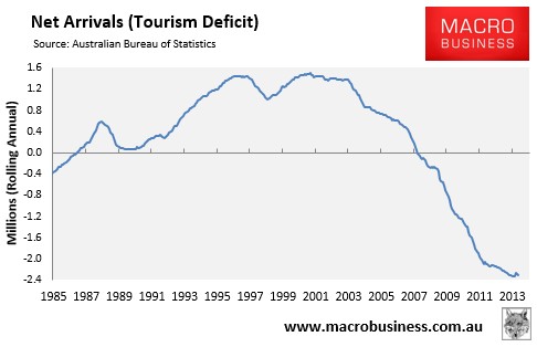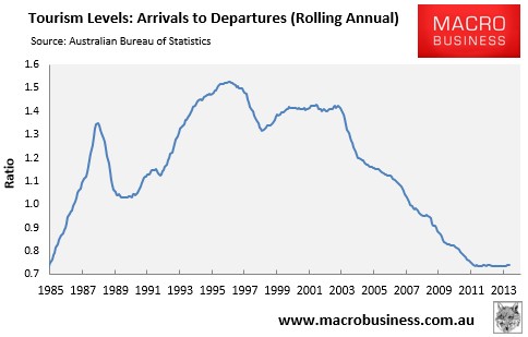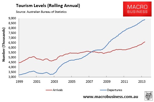 In the year to April 2014, 8.89 million Australians holidayed overseas over the year – a 139% increase on 10 years ago (3.71 million). However, this was partly offset by a record 6.59 million inbound tourists arriving in Australia over the year – a 34% increase on a decade ago (4.91 million).