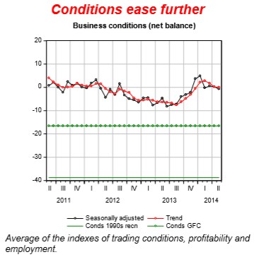 Business conditions dipped slightly again in the month, revealing an emerging trend lower since the start of the year. Together with the poor conditions reported by wholesale – a bellwether industry – it suggests little scope for improvement in domestic demand. Conditions varied significantly across industries: looking through the monthly volatility service industries remain the stand out performers, while most other industries are reporting negative conditions (the weakest being mining). Employment and profits remains soft (the latter is negative), while sales eased (still positive).