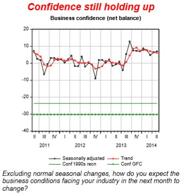Business confidence was unchanged in the month, at around long run average levels. That result was surprising, with firm’s still discounting persistently soft levels of business conditions and the negative sentiment surrounding the Federal budget – including the post-budget collapse in consumer confidence. Against that business was relatively sheltered from the Budget. Some leading indicators from the survey improved (especially new orders), but generally remain soft. However capital spending plans remain subdued and capacity utilisation broadly unchanged at relatively low levels.