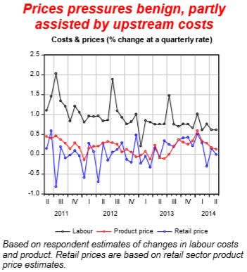 Firms continue to report relatively benign inflation pressures, assisted by lower purchasing costs and relatively low labour cost pressures. Retail prices also eased.