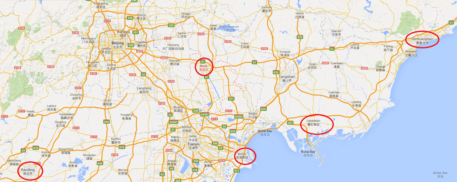 Here’s a map of the area. I highlighted Qinhuangdao in Hebei province, a site of overbuilding. Tangshan is on the map, also an overbuilt city, and I highlighted Caofeidian, which is an industrial development that drove a lot of growth in the region. Then in the southwest there is Baoding, which is hoping to become part of the larger regional economy. In Tianjin, I highlighted the Binhai development, as well as the Baodi area where all these empty villas are located.