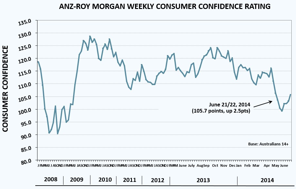The ANZ-Roy Morgan Research (RMR) consumer confidence index continues to gradually recover following its Budget induced shellacking, registering a 2.5 point lift in the week ended 22 June to be up 6.4% from May’s low (see next chart).