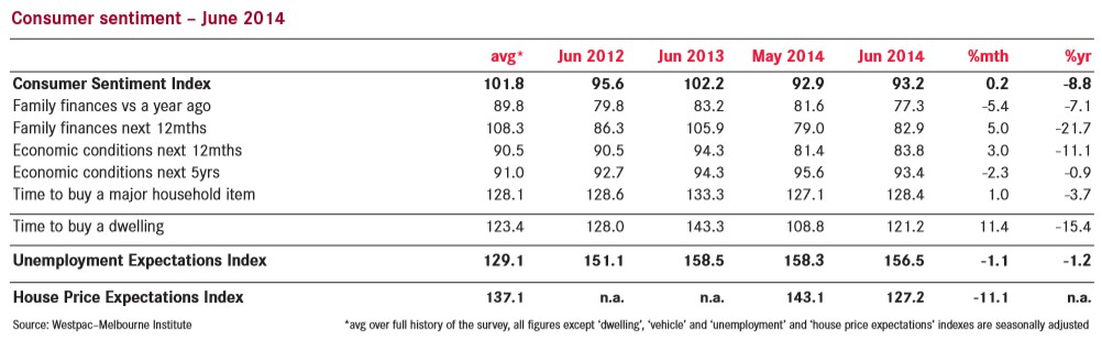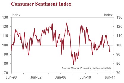 Family finances remain the focus of consumer concerns. The sub-index tracking assessments of ‘family finances compared to a year ago’ fell a further 5.4% in June to a new low, the lowest reading since May 2013. The sub-index tracking expectations for ‘family finances over the next 12 months” managed a 5% rise but that was coming off a severe 23% slump in May, with this month’s reading still the second lowest since the early 1990s recession. Views around the economic outlook have been more mixed. The sub-index tracking expectations for ‘economic conditions over the next 12 months’ recovered somewhat in June, the 3% rise after May’s 14% drop perhaps reflecting the stronger than expected growth figures from the Q1 national accounts. However, the sub-index tracking expectations for ‘economic conditions over the next 5 years’ retraced 2.3% in June after a strong 11% rise in May – the Budget clearly being viewed as a positive for medium term growth prospects. Consumer assessments of ‘whether now is a good time to buy a major item’ have been more resilient throughout the last two months with the sub-index rising a further 1% in June after May’s 3.2% gain.