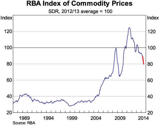 The iron ore market is very weak. You can read about that here. There’s a high risk of falls below $80 in the next month (before rebounding somewhat later in the year). That will mean all of the Budget’s estimated terms of trade (ToT) falls for next year are arriving instead before we even reach 2014/15. The RBA’s index of commodity prices is a good proxy for the ToT and will look roughly like this by year end: