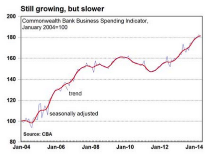 There are other circumstantial signs of damage too. The CBA’s Business Sales Indicator (BSI) – a measure of retail, cars and airline spending – rose by 0.3 per cent in trend terms in May – the slowest growth in 10 months, and is flattening out: