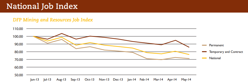 Welcome to the latest edition of the DFP Mining and Resources Job Index where we find the National Job Index fell 5.5% in May 2014. The rise seen in April was short lived with commodity prices, global supply fluctuations, and rising costs impacting the development of new projects and thereby contributing to the decline in May. Western Australia’s domination of all Mining and Resource job advertising fell back slightly from last month while the Queensland market continues to suffer with vacancies being halved over the past 11 months.
